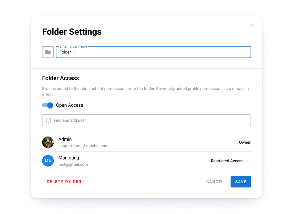 Profiles within a folder inherit permissions — enabling quick and flexible permission management across your team